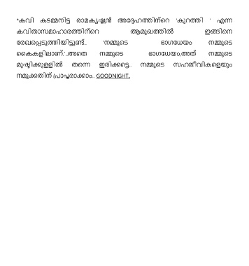 *കവി കടeനി< രാമകൃ{ൻ അേmഹിന്െറ 'കുറി ' എ. കവിതാസമാഹാരിന്െറ ആമുഖിൽ ഇEിെന േരഖെടുിയി<ുX്.. 'നeുെട ഭാഗേധയം നeുെട ൈകകളിലാണ്.'..അെത നeുെട ഭാഗേധയം,അത് നeുെട മുnിുളളിൽ തെ. ഇരിെ<.. നeുെട സഹജീവികെളയും നമുതിന് FപാHIരാാം.. GOODNIGHT.